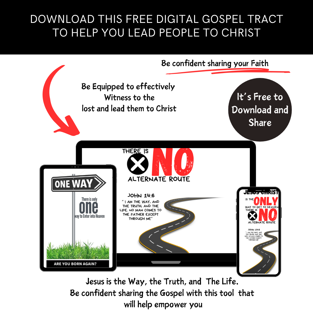 Looking for a powerful and simple way to share the Gospel?Ā No Alternate RouteĀ is a free digital tract designed to equip you to confidently witness to others about Jesus Christ. Based onĀ John 14:6, this tract emphasizes that Jesus is the ONLY way to salvationāthere are no alternate routes to heaven.